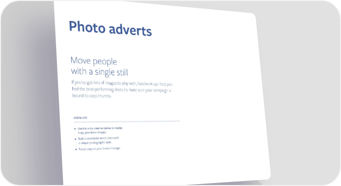 Photo adverts Move people with a single still If you've got lots of images to play with, Facebook can help you find the best-performing shots to make sure your campaign is bound to stop thumbs. USEFUL BITS • Use the wide creative canvas to display large, prominent images. • Build a consistent brand voice with a unique photographic style. • Focus copy on your brand message.
