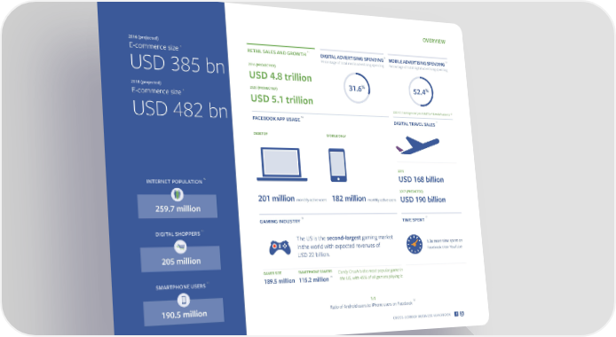 OVERVIEW 2016 (projected) 11 12 12 E-commerce size 8 RETAIL SALES AND GROWTH DIGITAL ADVERTISING SPENDING MOBILE ADVERTISING SPENDING Percentage of total media advertising spending Percentage of total digital advertising spending USD 385 bn 2016 (PROJECTED) USD 4.8 trillion % % 2018 (projected) 2020 (PROJECTED) 31.6 52.4 E-commerce size 8 USD 5.1 trillion 13 USD 3.11 average cost per install for FB mobile adverts USD 482 bn 14 11 FACEBOOK APP USAGE DIGITAL TRAVEL SALES DESKTOP MOBILE ONLY 2015 10 USD 168 billion INTERNET POPULATION 2017 (PREDICTED) 201 million monthly active users 182 million monthly active users USD 190 billion 259.7 million 15 17 GAMING INDUSTRY TIME SPENT DIGITAL SHOPPERS 10 The US is the second-largest gaming market in the world with expected revenues of 1.3x more time spent on 205 million USD 22 billion. Facebook than YouTube GAMER SIZE SMARTPHONE GAMERS Candy Crush is the most popular game in 10 16 the US, with 45% of all gamers playing it. SMARTPHONE USERS 189.5 million 115.2 million 1:1 18 190.5 million Ratio of Android users to iPhone users on Facebook CROSS-BORDER BUSINESS HANDBOOK