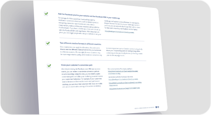Add the Facebook pixel to your website and the Facebook SDK in your mobile app To leverage all of the capabilities Facebook has built for mobile app on Facebook across all devices. For example, if a retail and e-commerce advertisers, such as dynamic product shopper browsed for watches on your mobile app but didn't retargeting, conversion optimisation and cross-device purchase, you can automatically retarget them with an advert measurement, make sure that your website is set up with the for that watch when they visit Facebook on their laptop. Facebook pixel. If you have a mobile app, make sure it is set up https://developers.facebook.com/docs/app-events with the Facebook SDK with App Events. With these items in place, you can target people who visit your website or use your Test different creative formats in different countries One creative does not apply for all markets. Set aside some be more responsive to price. Consider communicating clearly time to test the different creative formats for your audiences about your unique selling point and testing strong call-to- in different countries. For example, German customers may action copy so that you identify the best-performing creative be more responsive to quality, while American customers may prior to the campaign launch. Know your customer's conversion path After implementing the Facebook pixel, SDK and standard Get started with the Facebook pixel here: events, you can review cross-device conversion paths in https://www.facebook.com/business/a/online-sales/ adverts reporting. Using this data, you can identify typical conversion-tracking conversion paths and tailor your marketing to accommodate Get started with the Facebook SDK here: your customers' behaviour. For example, if your customers https://developers.facebook.com/docs/app-events tend to browse on their mobile device and purchase on desktop, you can draw their attention with video on mobile https://www.facebook.com/business/news/cross-device- and use an advert with a strong call to action on desktop. measurement https://www.facebook.com/help/510910008975690 CROSS-BORDER BUSINESS HANDBOOK