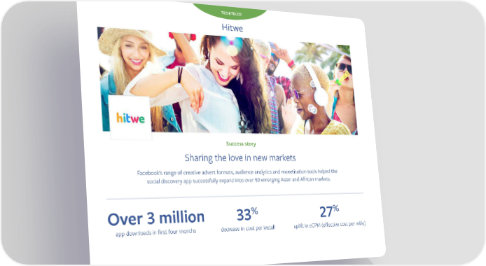 TECH/TELCO Success story Sharing the love in new markets Facebook's range of creative advert formats, audience analytics and monetisation tools helped the social discovery app successfully expand into over 50 emerging Asian and African markets. % % Over 3 million 33 27 app downloads in first four months decrease in cost per install uplift in eCPM (effective cost per mille)