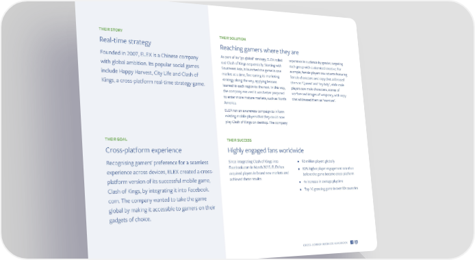 THEIR STORY THEIR SOLUTION Real-time strategy Reaching gamers where they are Founded in 2007, ELEX is a Chinese company As part of its "go global" strategy, ELEX rolled separated its audience by gender, targeting out Clash of Kings sequentially. Starting with each group with customised creative. For with global ambition. Its popular social games Southeast Asia, it launched the game in one example, female players saw adverts featuring include Happy Harvest, City Life and Clash of market at a time, fine-tuning its marketing female characters and copy that addressed strategy along the way, applying lessons them as "Queen" and "my lady", while male Kings, a cross-platform real-time strategy game. learned in each region to the next. In this way, players saw male characters, scenes of the company ensured it was better prepared warfare and images of weaponry, with copy to enter more mature markets, such as North that addressed them as "warriors". America. ELEX ran an awareness campaign to inform existing mobile players that they could now play Clash of Kings on desktop. The company THEIR GOAL THEIR SUCCESS Cross-platform experience Highly engaged fans worldwide Recognising gamers' preference for a seamless Since integrating Clash of Kings into • 50 million players globally experience across devices, ELEX created a cross- Facebook.com in March 2015, ELEX has • 80% higher player engagement rate than acquired players in brand new markets and before the game became cross-platform platform version of its successful mobile game, achieved these results: • 4x increase in average playtime Clash of Kings, by integrating it into Facebook. • Top 10 grossing game in over 80 countries com. The company wanted to take the game global by making it accessible to gamers on their gadgets of choice. CROSS-BORDER BUSINESS HANDBOOK