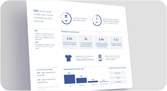 53% of UK social media users chose of shoppers already use say that they use smartphones 18 daily, clocking up an average of Facebook as their % their mobile in store % 2 hours 2 minutes per day 16 68 67 favourite16 % FACEBOOK WITH MILLENNIALS 21 17 European country where the personal screen has the largest market share (mobile screens altogether own 31% of 2.2x 2x 2.4x 1.7x 12 the market) % more likely than average to more likely to say that they more likely to say that they more likely to go online to 17 discover tech on Facebook will spend more time on will spend more time watching stream/download music of Brits plan to purchase more online their mobile in the future videos on their phone (23% for Facebook and Instagram 16 users) 30% who have access to a smartphone 44% expect advertising to be relevant say that it has enabled them to to them, particularly Facebook and "discover new products and services" Instagram users (58%) APP SHOPPERS ARE BIG SPENDERS 17 ONLINE PAYMENT METHODS USED19 OTHER PAYMENT METHODS USED19 2.6x | app compared to a 55% mobile site Skrill e-wallet 1.5x | app compared to a 32% desktop device 10% Mopay 3% Revenue generated by shopping by the average Visa MasterCard PayPal American Express ClickandBuy person in the UK.
