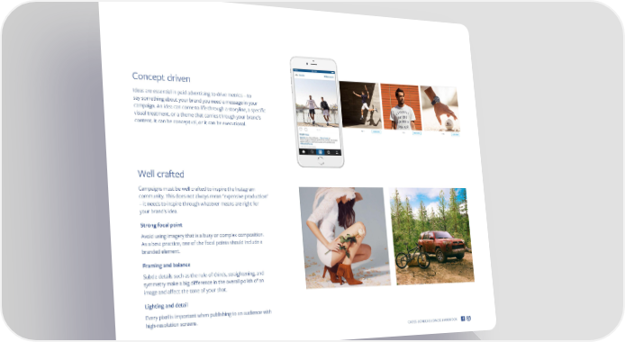 Concept driven Ideas are essential in paid advertising to drive metrics – to say something about your brand you need a message in your campaign. An idea can come to life through a storyline, a specific visual treatment, or a theme that carries through your brand's content. It can be conceptual, or it can be executional. Well crafted Campaigns must be well crafted to inspire the Instagram community. This does not always mean "expensive production" – it needs to inspire through whatever means are right for your brand's idea. Strong focal point Avoid using imagery that is a busy or complex composition. As a best practice, one of the focal points should include a branded element. Framing and balance Subtle details such as the rule-of-thirds, straightening, and symmetry make a big difference in the overall polish of an image and affect the tone of your shot. Lighting and detail Every pixel is important when publishing to an audience with high-resolution screens. CROSS-BORDER BUSINESS HANDBOOK