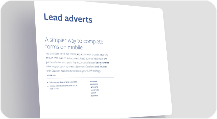 Lead adverts A simpler way to complete forms on mobile No one likes to fill out forms, especially with thumbs on a tiny screen that likes to autocorrect. Lead adverts help make the process faster and easier by automatically populating contact information such as email addresses. Combine lead adverts with Custom Audiences to boost your CRM strategy. USEFUL BITS • Spice up your lead adverts with video. APPLY NOW • Choose a call-to-action button to suit DOWNLOAD your advert: GET QUOTE LEARN MORE SIGN UP SUBSCRIBE