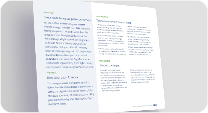 THEIR STORY THEIR SOLUTION Direct route to a great passenger service Talk to people who want to listen In 2012, LATAM Airlines Group was created LAN had a great offer to share, but also a audiences: people who liked the LAN good media strategy that took advantage Facebook Page, people who were interested through a merger between two of the industry's of Facebook's Custom Audiences to talk to in travelling to Latin America, and frequent leading companies: LAN and TAM Airlines. The people with an interest in travelling. flyers from the US to South America. group connects the region to the rest of the From 27-29 November 2014, the company The link adverts took visitors to the LAN launched a teaser campaign consisting of website, with audiences segmented by world through a flight network covering North link adverts in News Feed, which sought to country, so that they would find offers for and South America, Europe, the Caribbean capture a database of responses to its initial the destination they were interested in. discount offers. LAN also carried out a retargeting campaign and Oceania. Each year, LAN and TAM carry LAN then activated its Cyber Monday offer focussed on people who searched for a flight, about 66 million passengers to 135 destinations on Facebook on 1-2 December 2014 with a but did not buy one, during the five days in 24 countries and transport cargo to 145 message that spoke to three different target leading up to Cyber Monday 2014. destinations in 27 countries. Together, LAN and THEIR SUCCESS TAM operate approximately 1,500 flights per day, Beyond the target carrying one in two passengers in South America. Facebook Custom Audiences and During the two-day, offer the return on THEIR GOAL registrations accounted for 81% of the investment doubled, achieving a 3.4x Next stop: Latin America total sales from display. Thanks to these return. During the teaser phase, 25% of the tools, LAN was able to reach people who registration forms came via Facebook. And The main goal was to increase the sale of air had visited the website but abandoned the platform's cost per acquisition was 14% their purchase, people who were interested cheaper than with other media. tickets from the United States to Latin America in flying with LAN, and people with during the biggest online sale of the year, Cyber similar profiles who were attracted by the destinations being promoted. Monday: a special day of online discounts taking place on the Monday after Thanksgiving Day in the United States. CROSS-BORDER BUSINESS HANDBOOK