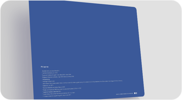 Philippines 1 Worldometers, accessed Feb 2016 2 CIA World Factbook, Jun 2015 3 Facebook Audience Insights Tool, 6 Dec 2015 – 6 Jan 2016 4 Philippine Statistics Authority, 4 Apr 2012. Retrieved 6 Nov 2015. 5 Wikipedia.org 6 Tradingeconomics.com 7 International Telecommunication Union, ComScore via UBS, Nielsen's global survey of e-commerce (Q1 2014), eMarketer, Trend Marco, MasterCard, Paypal, VECITA, A.T. Kearney 8 eMarketer, Jun 2015 9 Newzoo Global Games Market Report, 2015 10 Filipino on Facebook, TNS Study (commissioned by Facebook), 2014, N = 1021 11 Based on Facebook data, Mar 2016 12 Reach study, TNS (commissioned by Facebook), 2015, N = 1069 13 "Global-ecommerce-payments-guide", Adyen.com, 2015 CRCROSOSSS-BORDER BUSINES-BORDER BUSINESS HANDBOOKS HANDBOOK